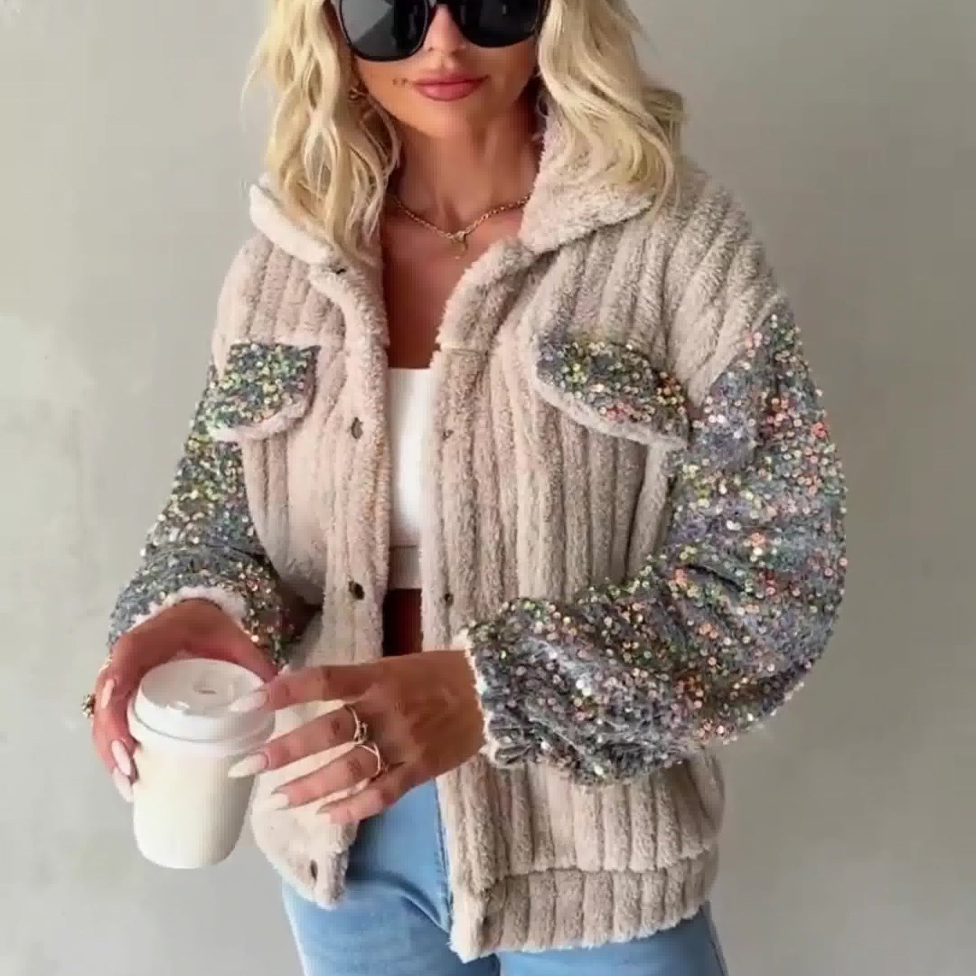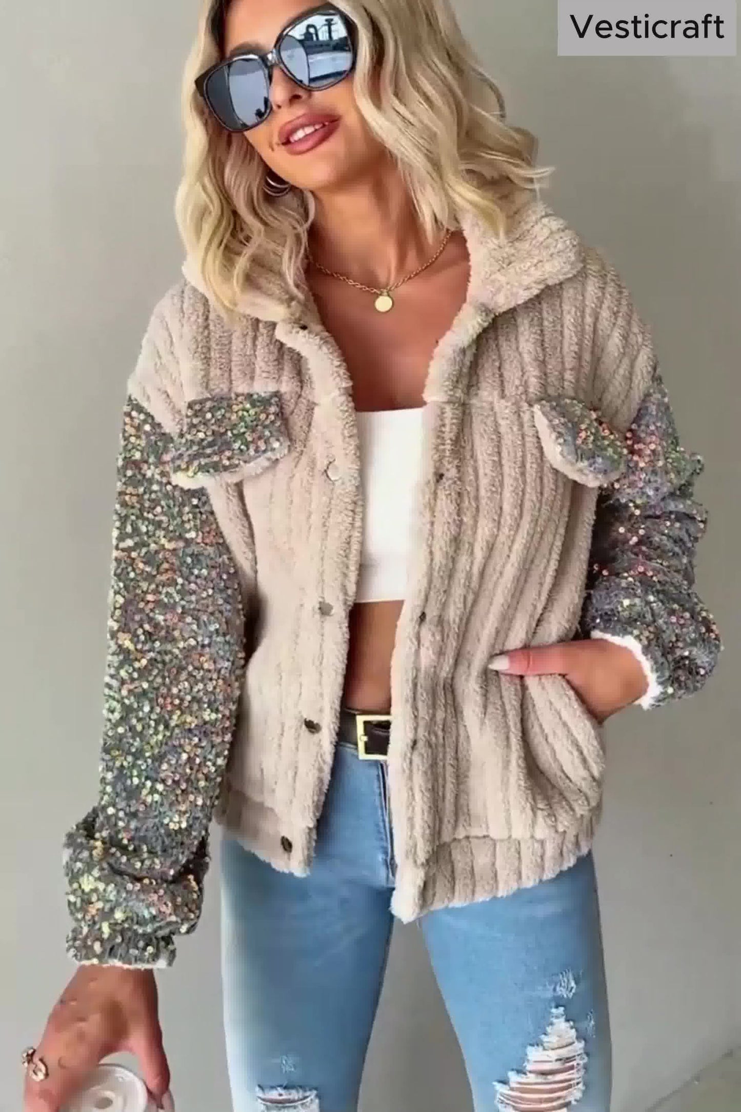 Avec ses manches ornées de paillettes scintillantes, Lustra est la veste idéale pour celles qui aiment allier style et originalité. Chaque mouvement capte la lumière, ajoutant une touche d’éclat subtile mais captivante. Son patchwork raffiné mélange textures et contrastes pour une allure résolument chic et moderne, idéale pour une sortie en ville, une soirée entre amies ou une séance photo tendance.